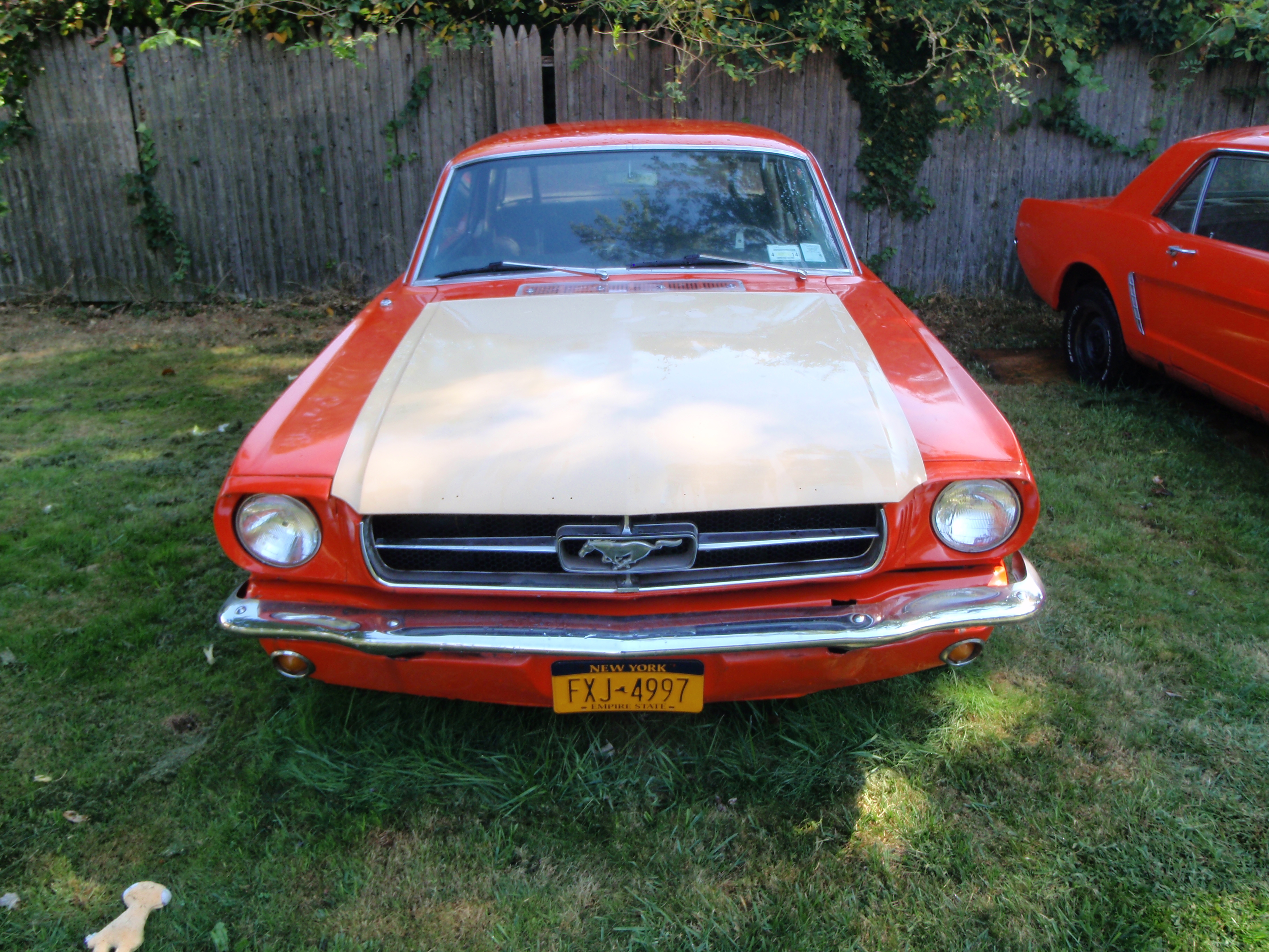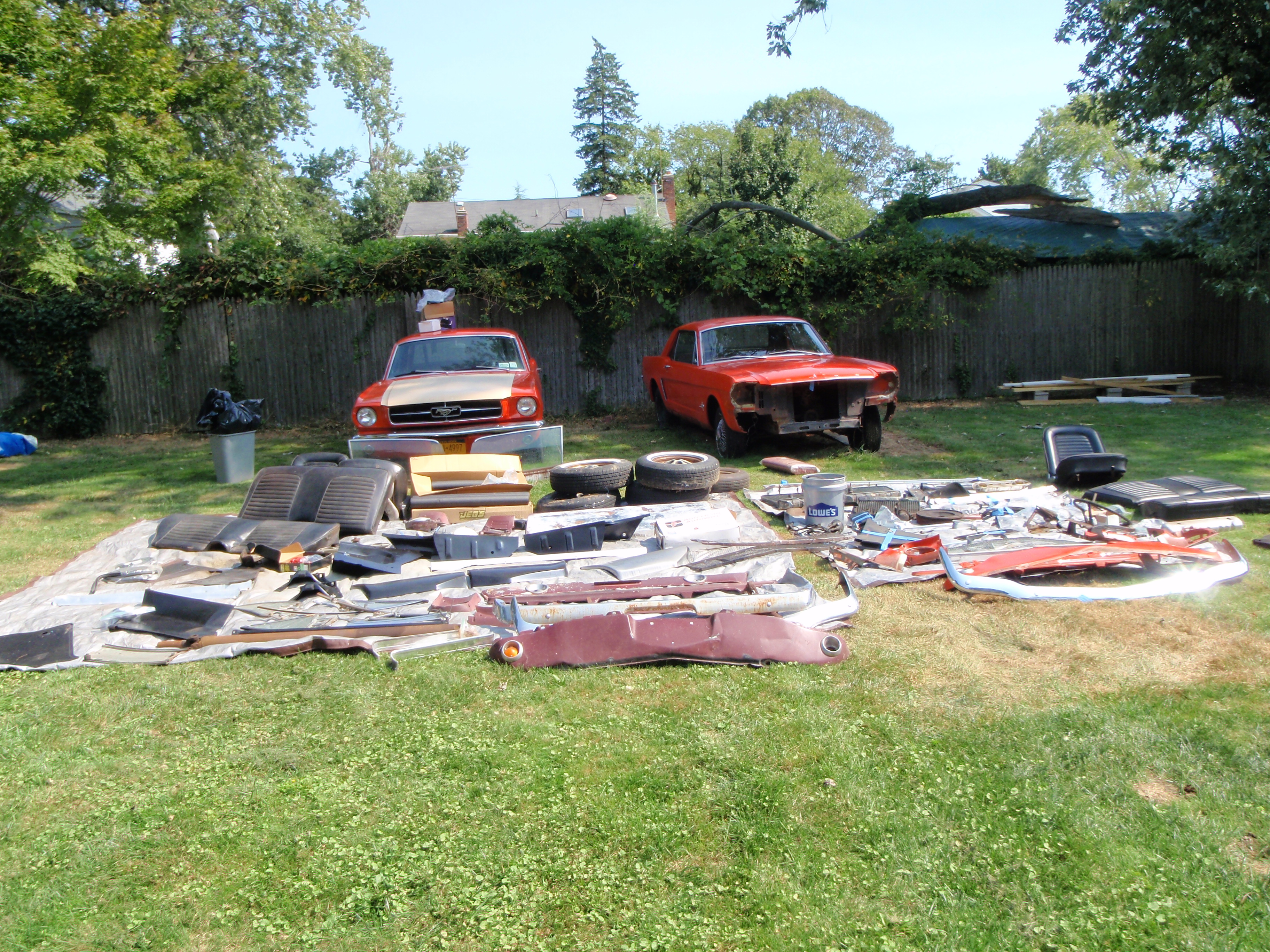 I am selling my 2 1965 Mustangs along with a collection of additional parts. The 2 cars I will call Daily Driver, the one with the beige hood on the left, and restorer, the one with the orange hood and on the right.