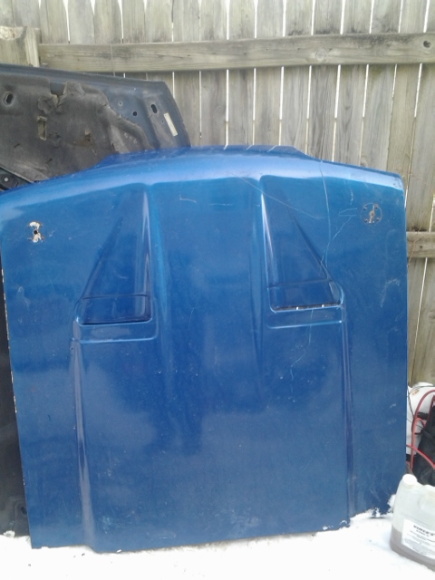 Hood is in good shape needs some fiberglass on the underneath or maybe just some gorilla glue where there is a small crack on each side near the hinges, nothing big and it is not going to break so nothing serious. Hood looks good on the car and its a bolt on. Good cheap hood if your on a budget. Price is 150 OBO